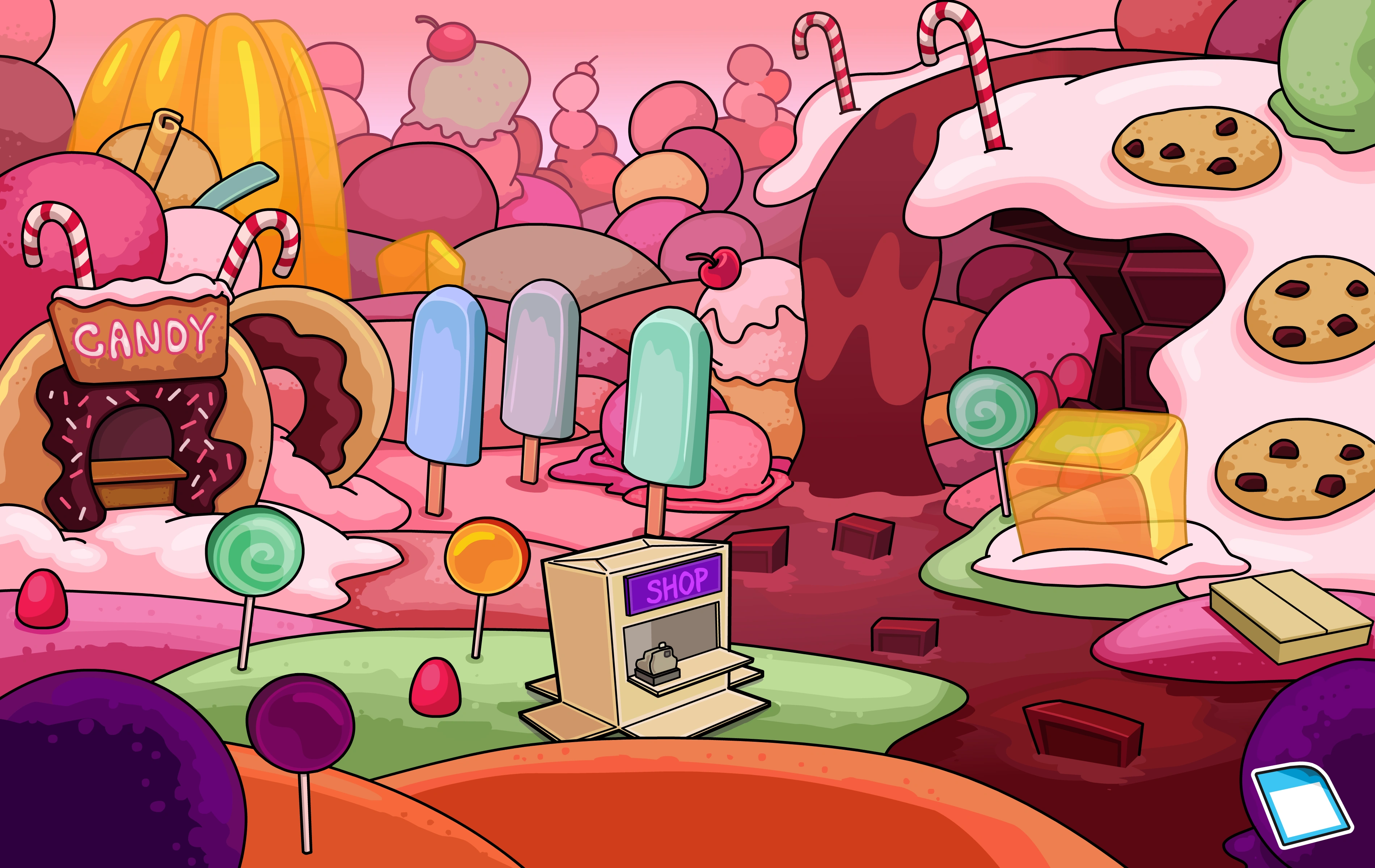 The Candy Dimension was a party room accessible during the April Fools' Party 2017, April Fools' Party 2019 and April Fools' Party 2020. Players were able to earn the Food Fight Stamp here by throwing a snowball.